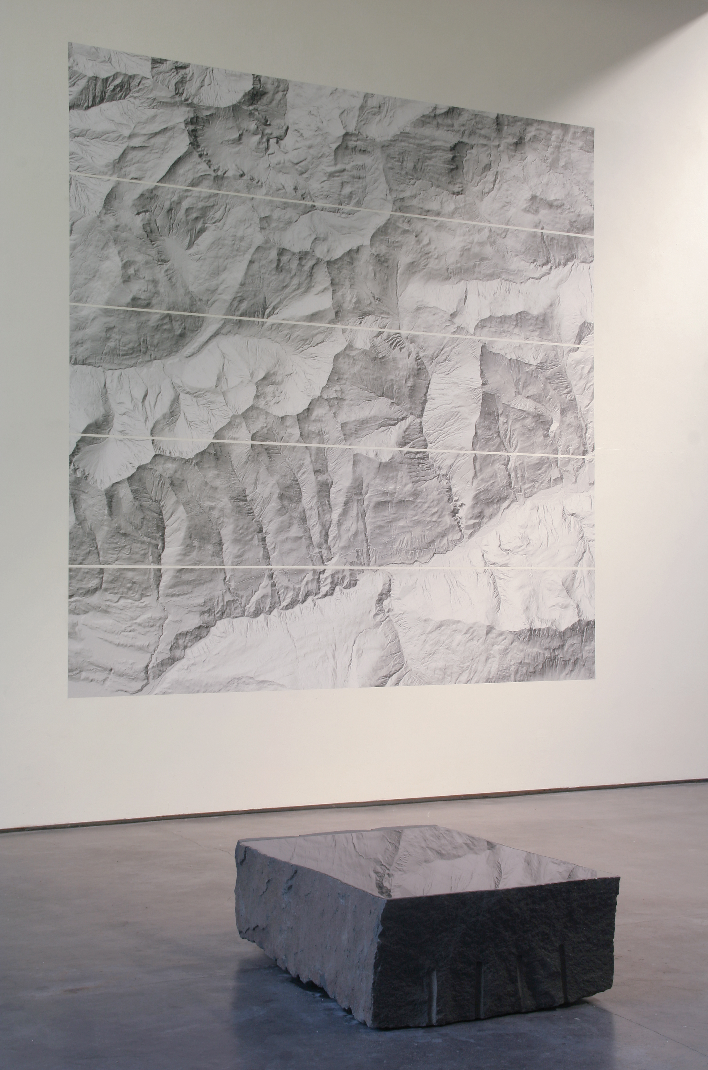 What appears artificial in the exhibition space and context is only seemingly natural in the ostensibly documentary gesture of photographic image-making. Equally appropriate is the inversion, according to which the photographic image is much more of an artificial artifact, because it only reproduces the natural, while the sculpture with its artificial interventions of shaping is much more true nature, because it leaves it as it was found in part. This complex interweaving of natural and artificial by means of the pictorial appearance - be it three-dimensional, sculptural nature or two-dimensional, photographic print, this interweaving is conceptually intensified in the series of pictures created for this exhibition. The series is based on an overall image that uses a computer simulation to reproduce an altered representation of measurement data of an Austrian mountain valley in a pictorial invention that has excluded vegetation and civilization in a model-like manner. What remains is a bird's eye view of a purely geological landscape that is the stone sculptor's dream and nightmare: an inhospitable, artificial paradise in which stone has come into its own. From here it is only a short step to the pure stone surface of the Moon and Mars.