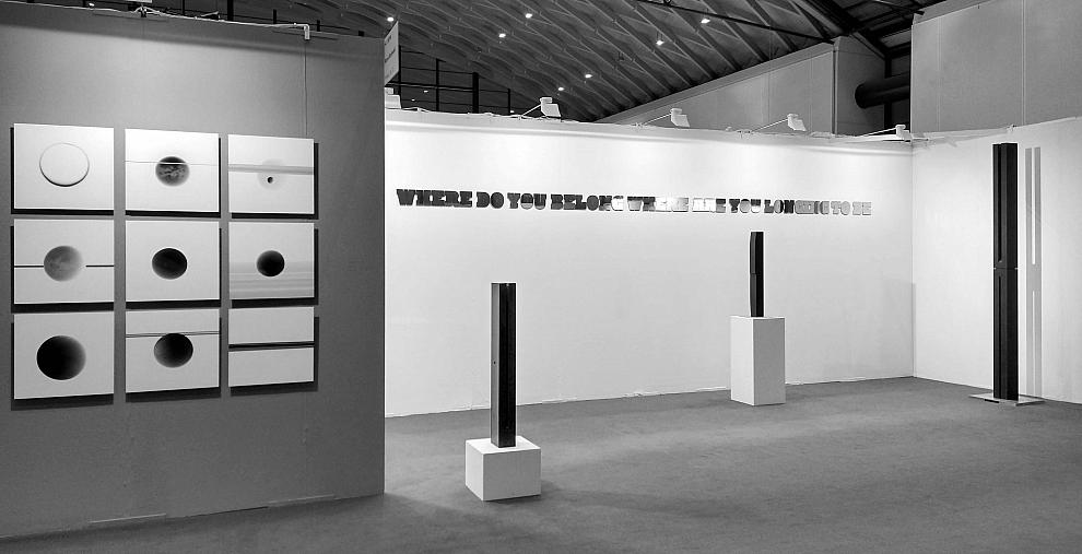 Galerie-Strandpräsentation mit Bildkonzeptionen, einer Schriftinstallation und einer Auswahl von Steinskulpturen.