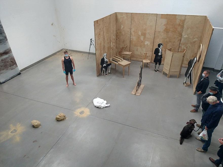 Bild 02: Momentaufnahme nach Eröffnungs-Performance "Absence" (Bildmitte: Kugelstoßer Justus Münzer, nach Performance mit jk) | dahinter: "Beethovenzimmer", Maurizio Kagel