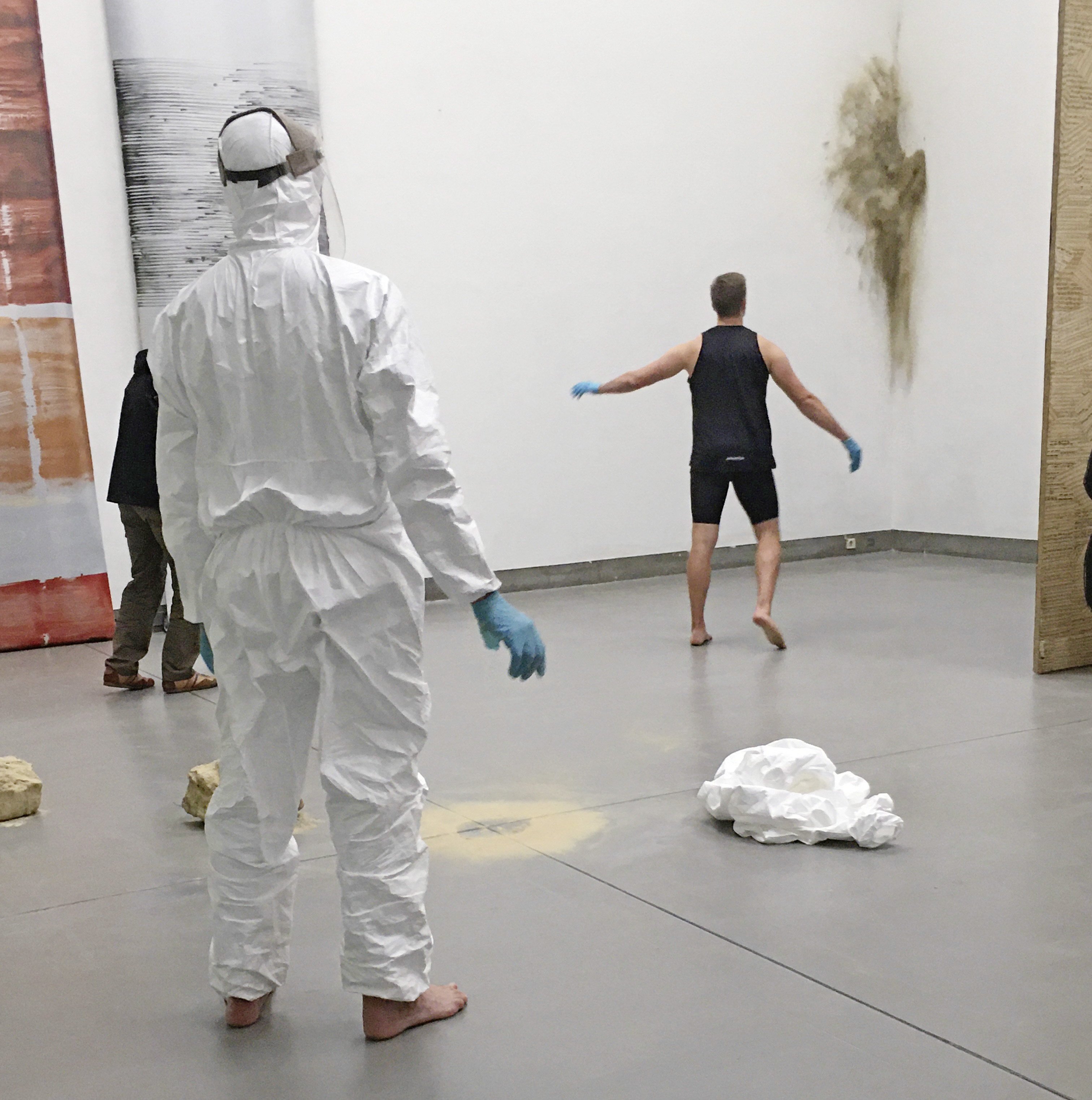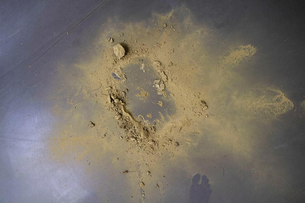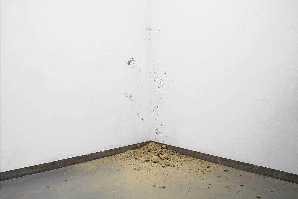 Three of the nine chunks laid out are hurled by a shot-putter from the center of the room into the corner of the room. They remain there as a mixture of sand and dust in the corner of the room for the duration of the exhibition. The three impact points are visible on the walls, similar to a score. So are the three empty spaces of the removed, absent chunks from the linear sequence of nine rocks (see fig.2).