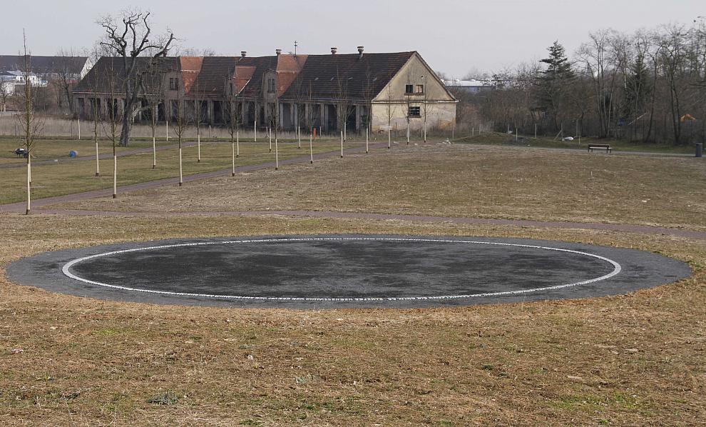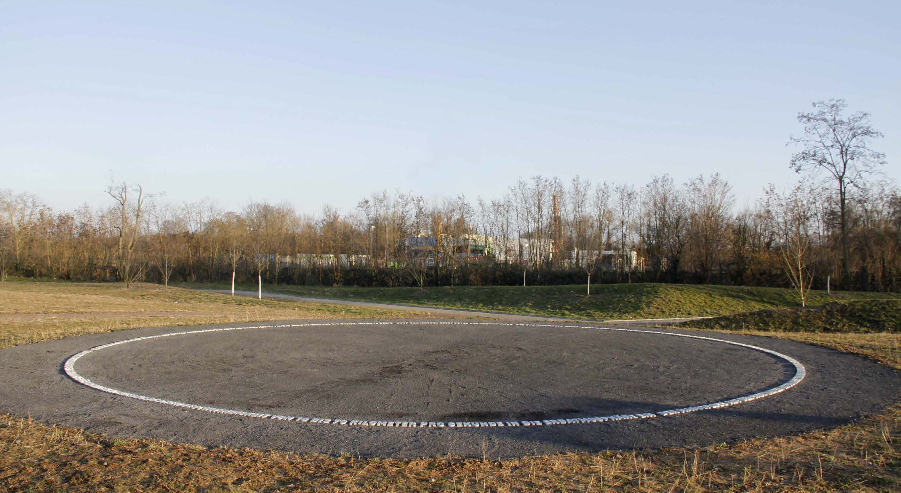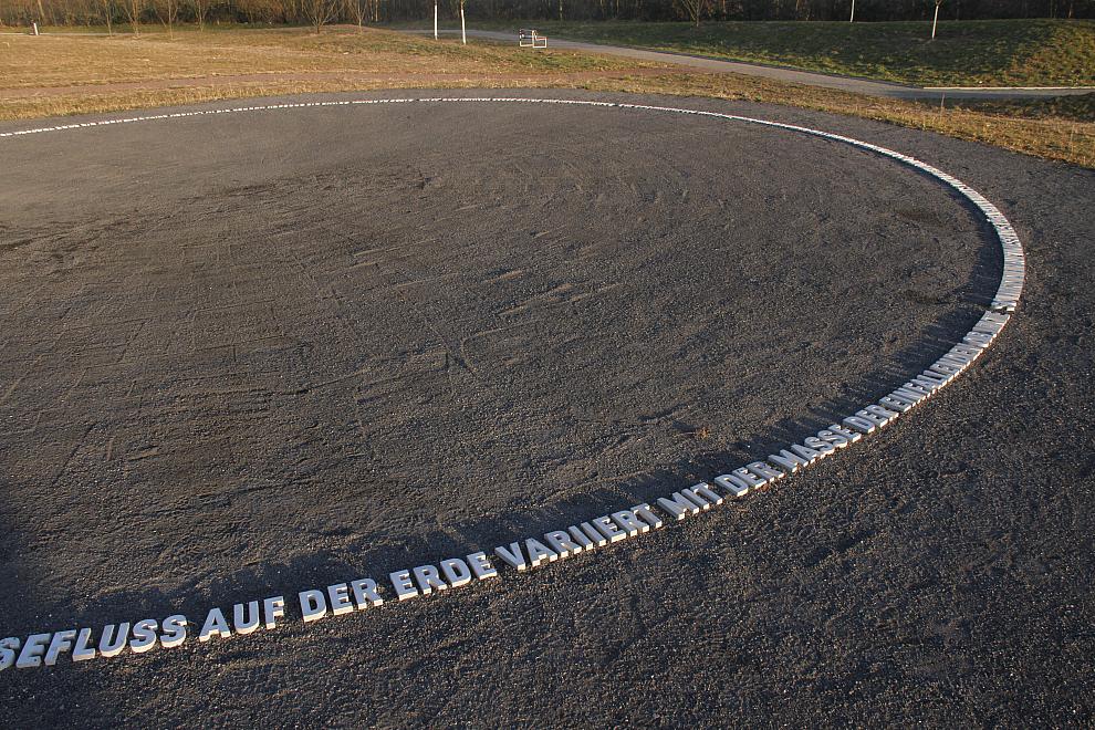 DerMassefluss 2011/2015 Landesgartenschau Landau 2015, Aluminium-Blockschrift im Boden eingelassen. Durchmesser: 12,73 m (= 1/millionstel des Durchmessers der Erde)