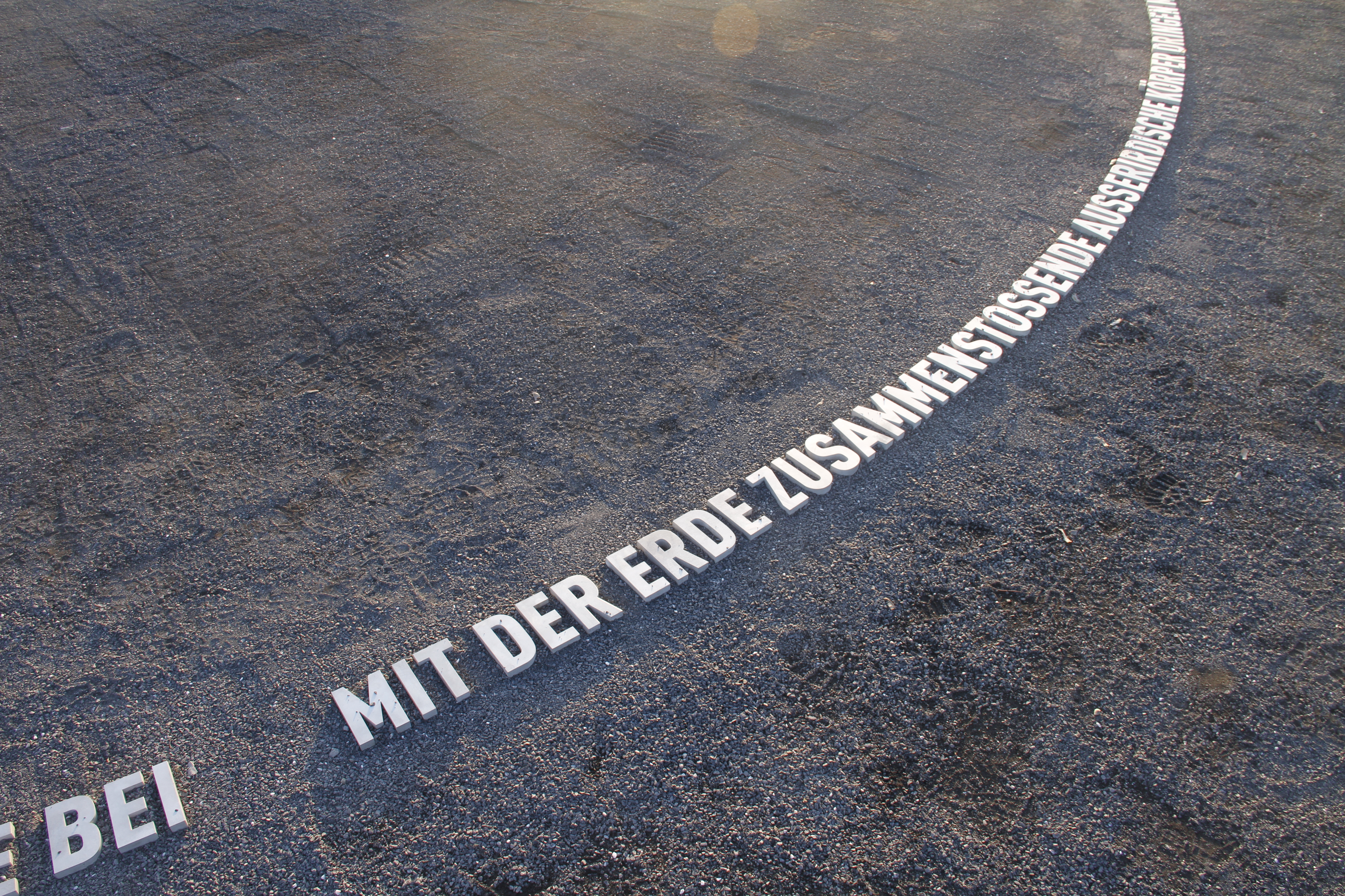 Der Text ist von außerhalb des Kreises lesbar, der Innere Raum wird in der Installation zu einem magischen, gewissermaßen unbetretbaren Ort - einem Sammlungsort kosmischer Materie. Sich abzeichnende Laufpfade am Schriftkreis sind erwünscht.