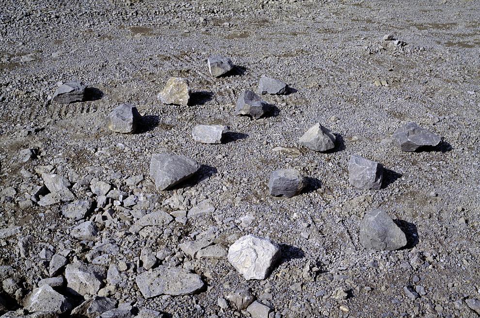 Kalk-Bruchsteine aus dem Steinbruch "Cantera del Grau" bei Montserrat/ Barcelona | Linienlaser | Installationsansicht in der Galerie Maria Villalba, Barcelona, Bild 2: Auswahl der Steine im Steinbruch | ca. 500 x 780 x 45 cm