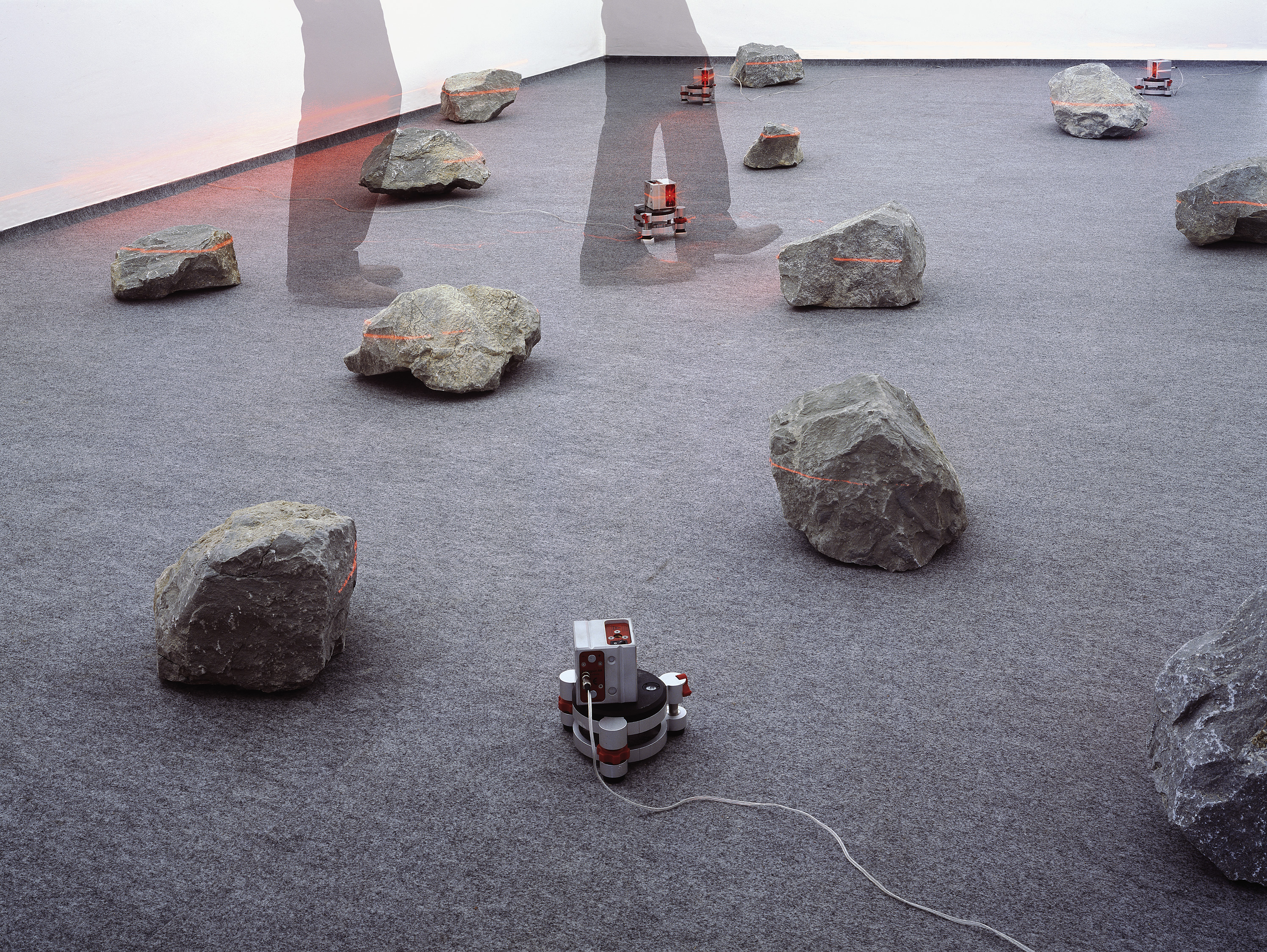 (...) Ein größerer Kontrast als der praktisch unbearbeitete Bruchstein und das hochtechnoide Lasergerät sind schwer vorstellbar. Gemäß der dualistischen Philosophie Ostasiens, die Kitzbihler seit dem Studium bei Hiromi Akiyama und mehreren Asienreisen geläufig ist und sein Schaffen zweifellos geprägt hat, werden Gegensätze aufgebaut, um sie zu überwinden. In ihrer „Über-Natürlichkeit“ repräsentiert die Installation IM INNEREN ein größeres System, nämlich auf der einen Seite die Kultur, vertreten durch ein technisches Gerät, und die Natur auf der anderen. In der spannungsreichen Kombination ergibt sich jedoch sogar ein die Installation transzendierender Sinn. Betritt der Betrachter das Gesteinsfeld, so wird er zum interaktiven Bestandteil der Installation, empfängt selbst den Lichtstreifen und wirft Schatten auf die Steine, wodurch die kontinuierliche Linie, im Sinn einer systemischen Reaktion, unterbrochen wird. In der Subjekt-Objekt-Wechselwirkung, die durch das Betreten der Installation einsetzt, zeigen schon geringfügige Veränderungen eine erhebliche Wirkung. Hier lässt sich durchaus ein unmittelbarer Gegenwartsbezug herstellen, etwa in Bezug auf Schwankungen in den komplexen Ökosystemen der Natur, deren labile Balance schon durch geringfügige zivilisatorische Interventionen massiv gestört werden kann.