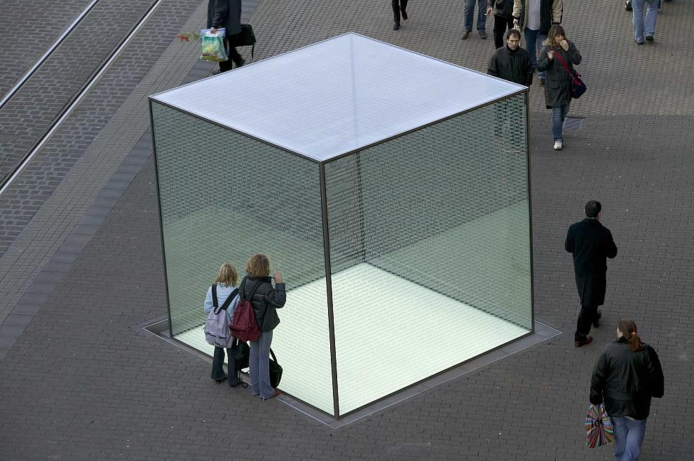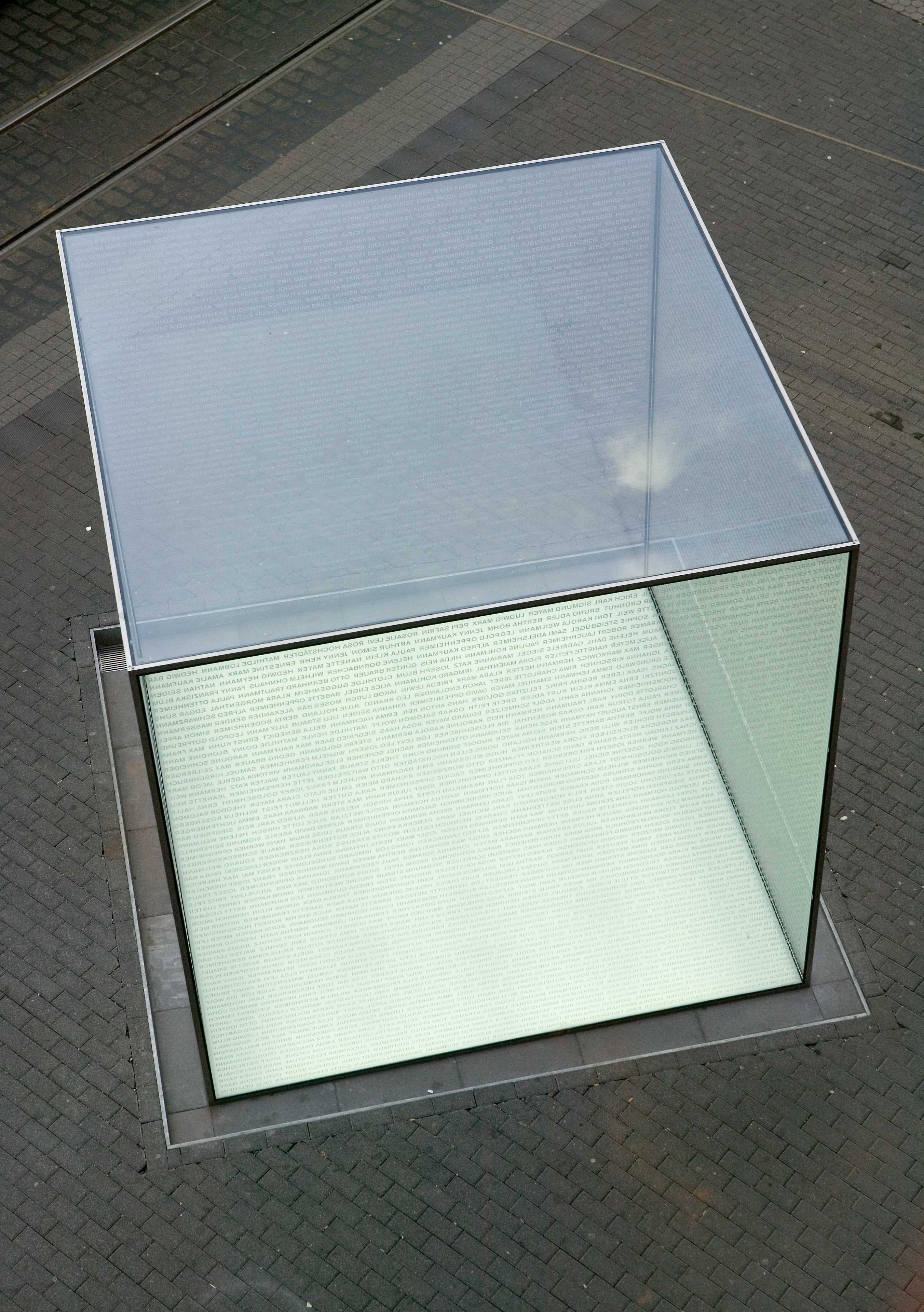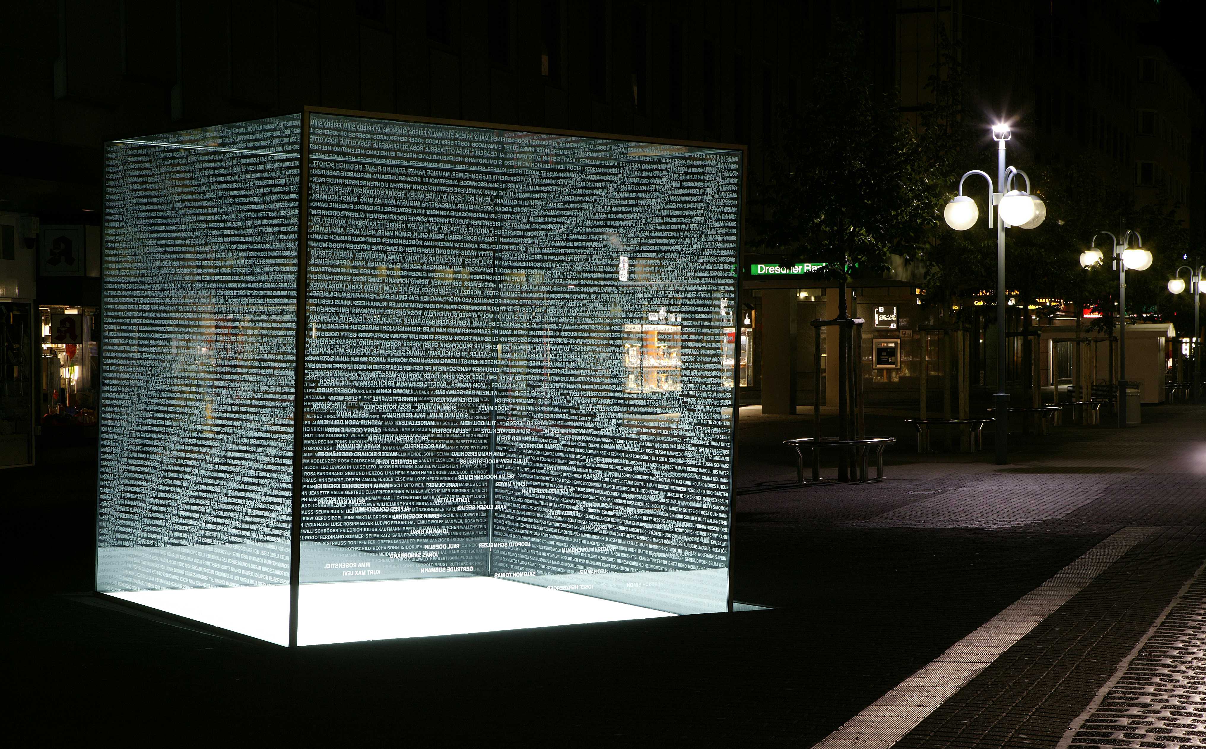 Am eindringlichsten ist die Gedenkskulptur für die jüdischen Opfer des Nationalsozialismus in Mannheim abends oder nachts: Durch ein Dutzend Leuchtstoffröhren von unten angestrahlt, wirkt das Artefakt von weitem als irisierendes Lichtfeld. Ein scheinbar schwebender Schrein der Erinnerung, auf dessen Wänden über zweitausend Namen in Spiegelschrift eingraviert wurden - Namen von jüdischen Mannheimern, die die Gestapo in einer Aktion der regionalen Gauleiter Wagner und Bürckel Ende Oktober 1940 unter Beifall der Bevölkerung am helllichten Tag zusammentrieb und anschließend ins südfranzösische Gurs verschleppte.