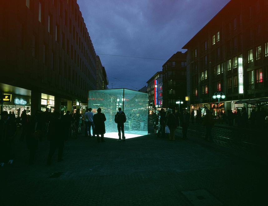 Eine Störung im visuellen Chaos, ein brillant-bleicher Klecks inmitten kommerzieller Stadtraummöblierung, ein fahl-fragiler Flicken unter all den bunten Aufgeregtheiten einer Einkaufsmeile: Der gläserne Kubus auf den Mannheimer Planken ist durchsichtig und wirkt doch als Monolith, scheint grazil und zart und hält doch dem Aufprall von Motorrädern stand, schafft einen eigenen, in sich gekehrten Raum und steht dennoch mitten im Leben zwischen Brezelbub und Eisverkäufer, Trambahnhaltestelle und Kaufhaus.